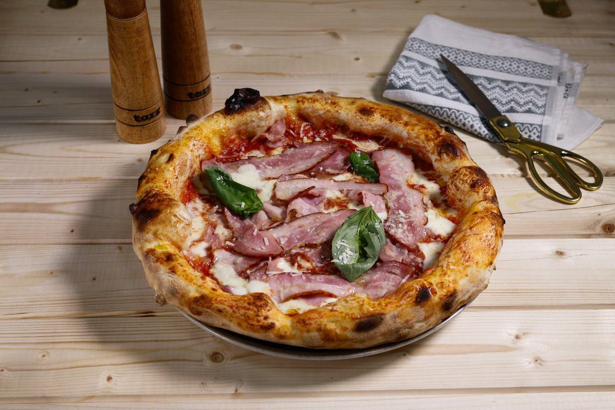 Aluat 280g, Sos de roșii 100ml, Mozzarella 100g, Bacon 40g, Prosciutto Cotto 70g, Salam Napoli 40g, Parmezan 10g, Busuioc 3g, Ulei Măsline 3ml