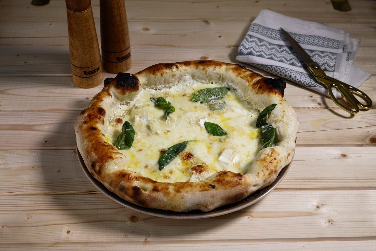 Aluat 280g, Sos alb 100ml, Mozzarella 100g, Brie 30g, Gorgonzola 40g, Parmezan 40g, Busuioc 3g, Ulei Măsline 3ml