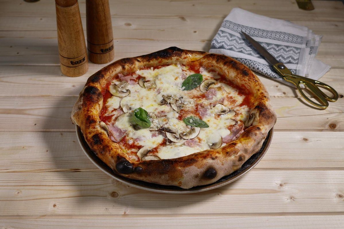 Aluat 280g, Sos de roșii 100ml, Mozzarella 100g, Prosciutto Cotto 100g, Ciuperci Brune 80g, Parmezan 10g, Ulei Măsline 3ml