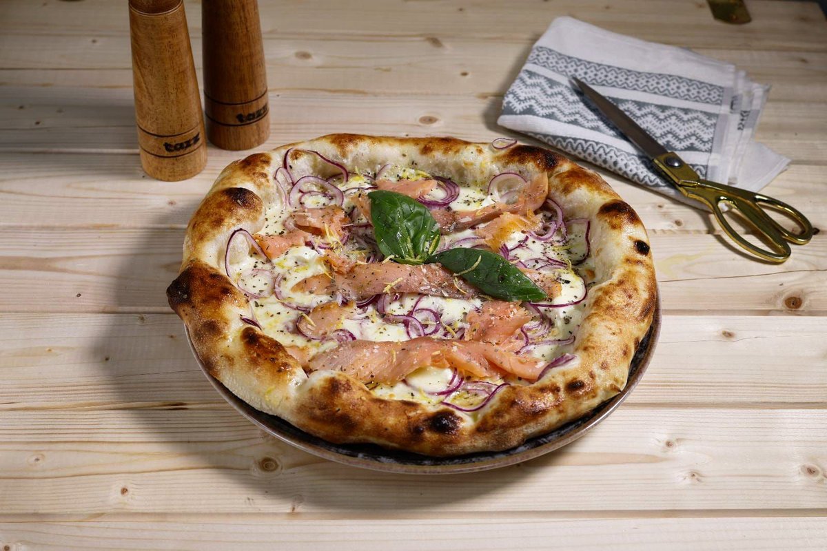 Aluat 280g, Sos alb 100ml, Mozzarella 120g, Somon 50g, Ceapă caramelizată 30g, Rucola 20g, Parmezan 10g, Ulei Măsline 3ml