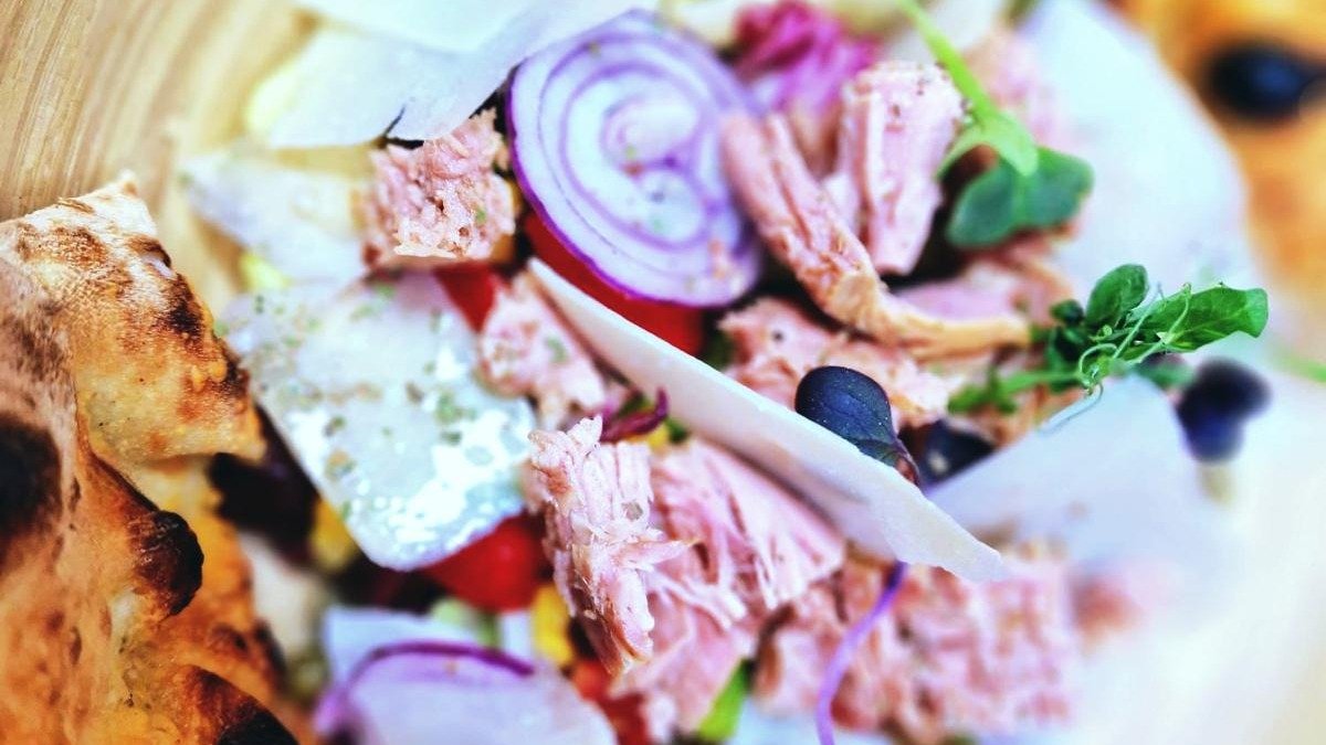 Salată Mix 75g, Ton 130g, Roșii Cherry 60g, Măsline kalamata 30g, Porumb 10g, Ardei gras 30g, Ceapă roșie 15g, Capere 5g, Parmezan 10g, Focaccia – 3 Felii 465g