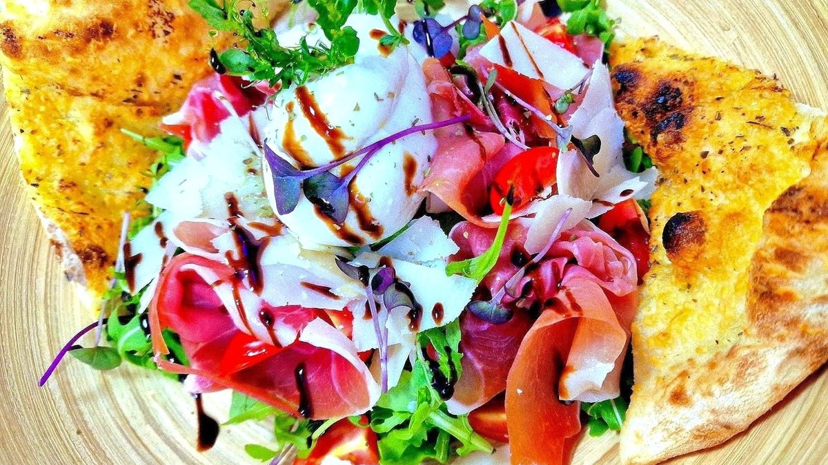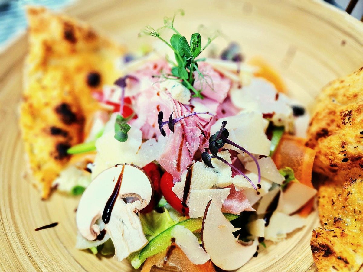 Rucola 75g, Prosciutto Crudo 80g, Burratina 125g, Roșii Cherry 60g, Porumb 10g, Ardei gras 30g, Ceapă roșie 15g, Capere 5g, Parmezan 10g, Cremă oțet balsamic 2ml, Focaccia – 3 Felii 467g