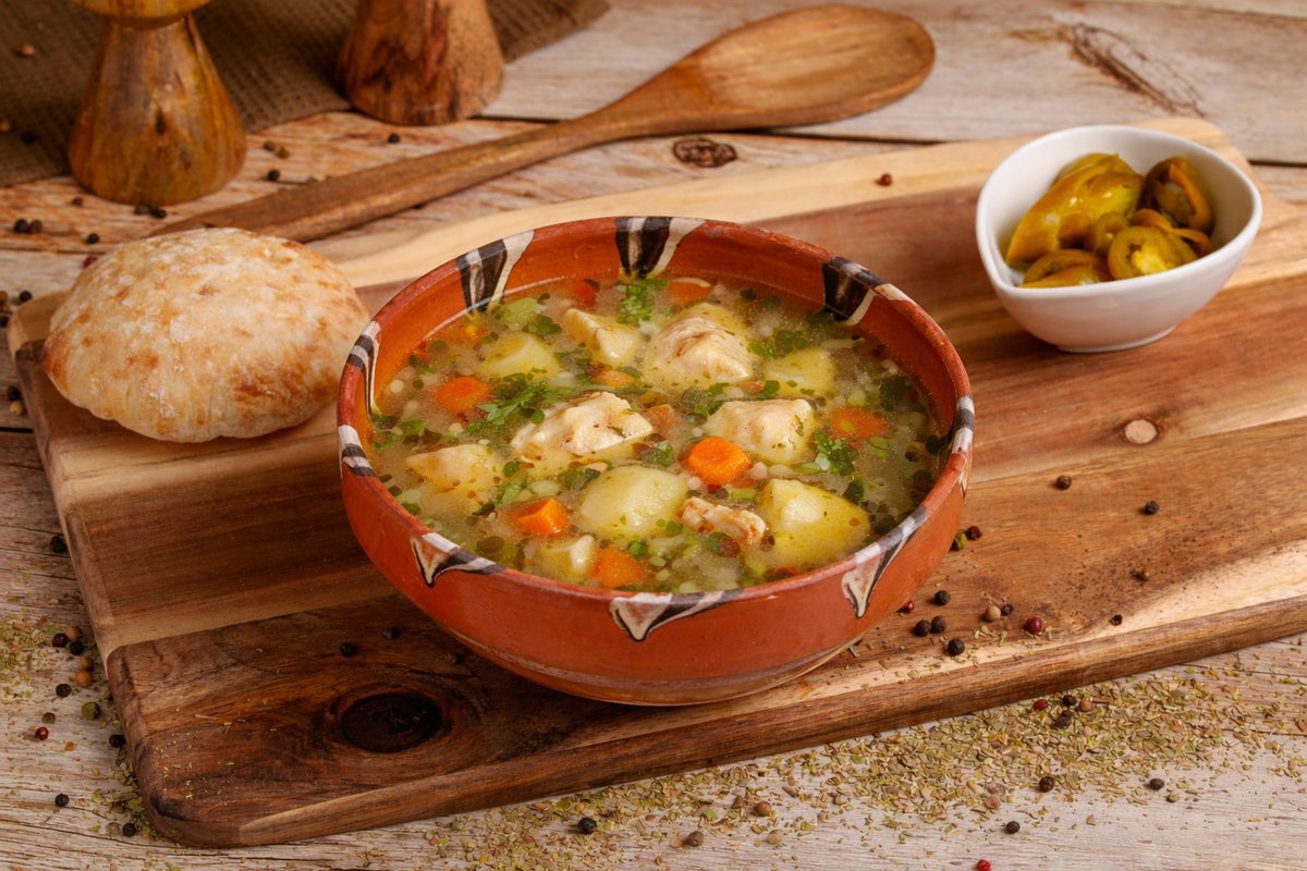 Ciorbă de cartofi cu afumătură 400ml, chiflă 60g, ardei iute 20g