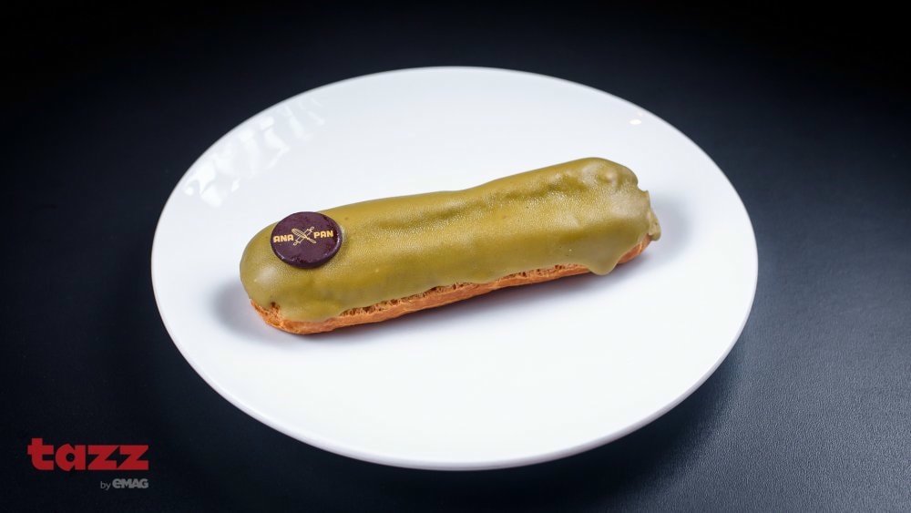 Coaja pufoasa de ecler facuta de cofetarii nostri, umpluta apoi cu crema de vanilie, pasta de fistic 100% naturala si frisca naturala. Este glazurat cu ciocolata alba si pasta de fistic, prin urmare, gustul si culoarea sunt naturale, specifice fisticului. 80g