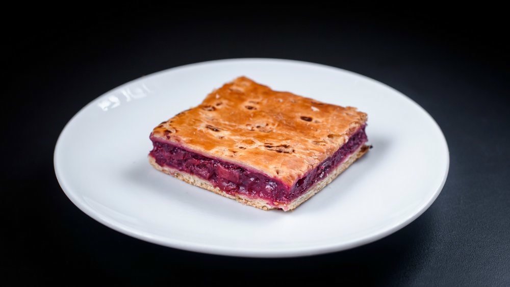 Un desert dulce-acrisor, perfect pentru cei care prefera fructoza. Nu are zahar adaugat. Este compus din foietaj cu umplutura bogata de visine. 90g