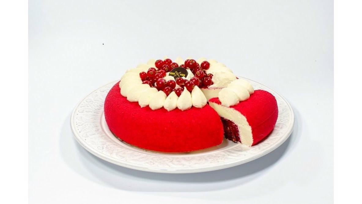 Red Velvet Cake -un decor inedit si un contrast intre textura si gust, avand o combinatie intre blatul usor umed, piureul de zmeura si textura pufoasa a mousse-ului cu crema de branza. Este un tort fara zahar adaugat, cu indulcitor natural Green Sugar, iar culoarea este obtinuta cu concentrat de sfecla rosie Greutate 0.92 kg / buc