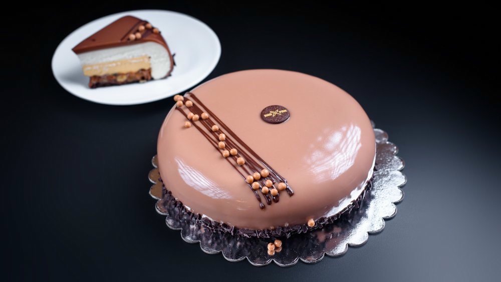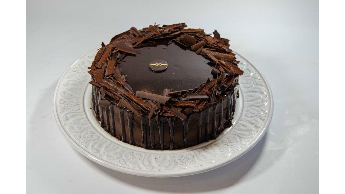 Un deliciu, o irezistibilă alternanță de blaturi brownie de ciocolată și ganache de ciocolată, îmbrăcat în glazură oglindă și fulgi de ciocolată neagră. Gramaj 1,1 kg