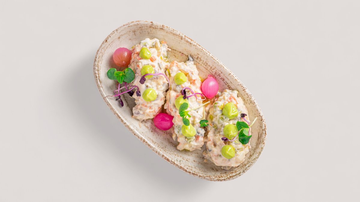 Ingrediente: cartofi, castraveți murați, pulpă de vită, muștar, maioneză, mazăre*, morcov, sare, piper 200 g
