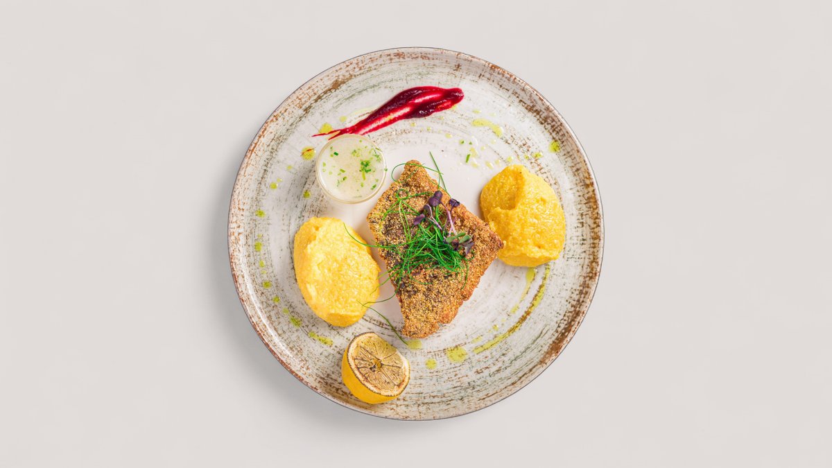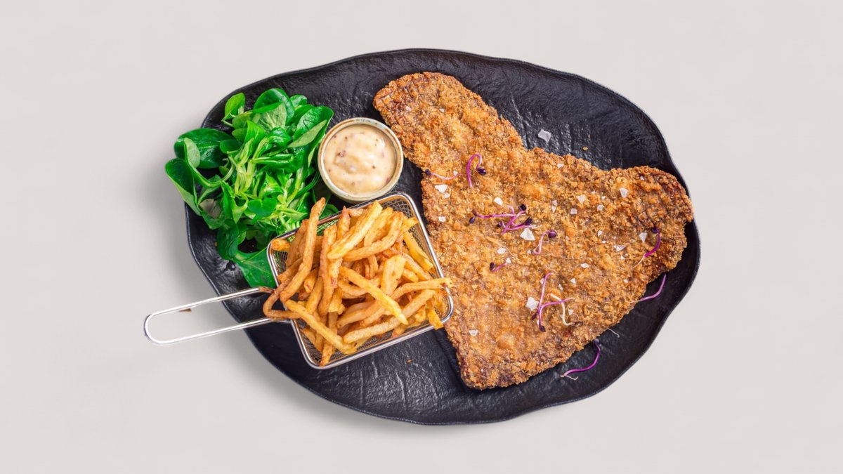 300 g + 180 g Ingrediente: pulpă de vițel, cartofi, ulei de floarea soarelui, făină, ou, pesmet panko, sare, piper