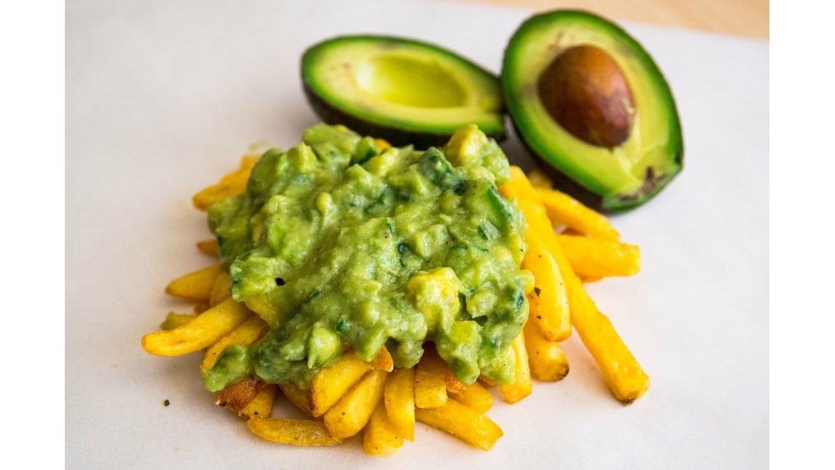 Guacamome (avocado proaspăt, castravete, ceapă roșie, lime) și cartofi prăjiți condimentați 250 g