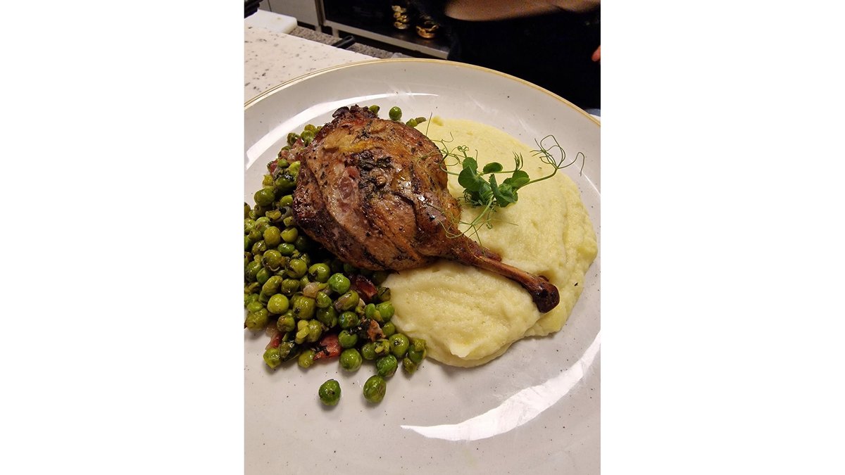 Piept de rata, piure de cartof dulce, spuma de wasabi