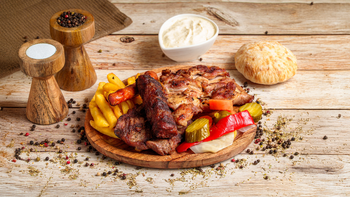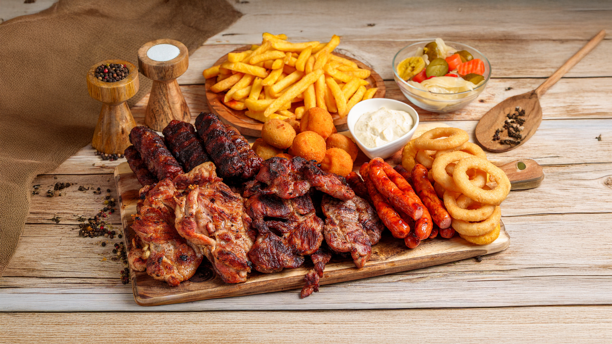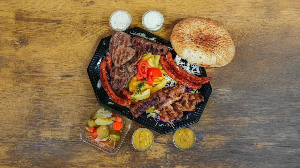 Ceafă de porc 500g, pulpă dezosată 400g, cârnăciori 200g, mici vită porc 340g, inele ceapă 200g, bulete de pui cu brânză 320g, cartofi dippers 300g, murături asortate 300g, sos (usturoi + ketchup) 200g, chiflă 600g - aproximativ 3360g