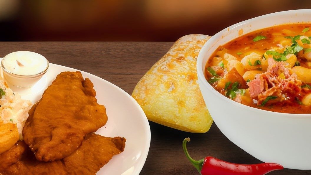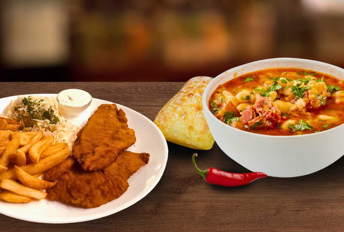 Ciorbă de fasole cu ciolan 400ml, chiflă 60g, ardei iute 20g