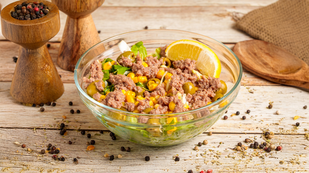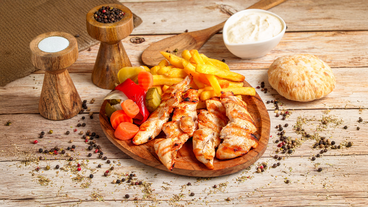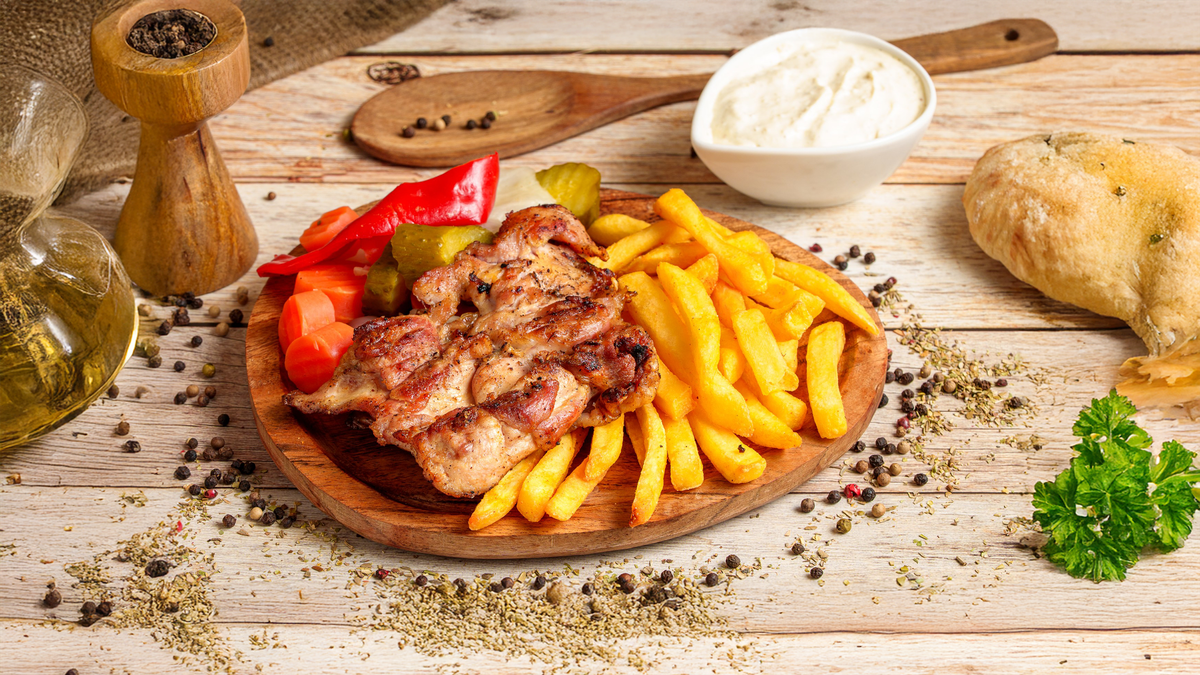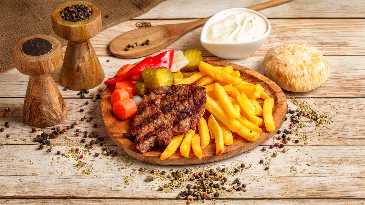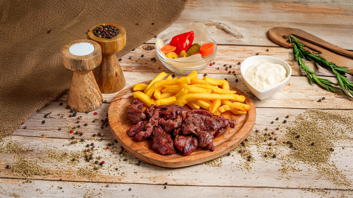 Pastramă de oaie, legume, sos, chiflă, cartofi - 650g