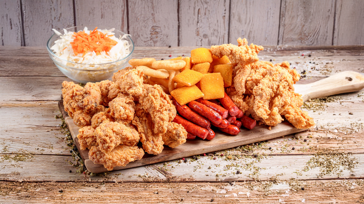 Aripioare picante 330g, gujoane piept de pui 210g, pulpe barbeque 450g, cașcaval pane 280g, bulete de brânză cu chilly 140g, bulete de pui cu cașcaval 200g, mozzarella stick 120g, inele de ceapă 200g, cartofi 300g, sos 200g - 2400g