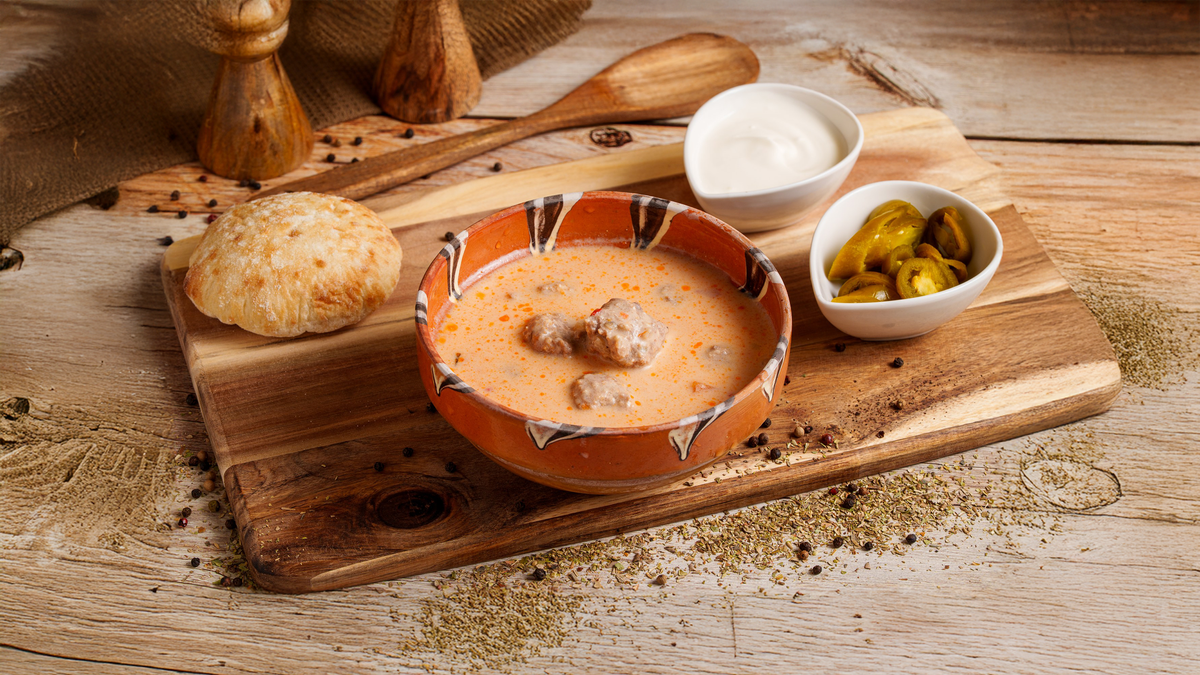 Ciorbă de perișoare 400ml, chiflă 60g, smântână 50g, ardei iute 20g