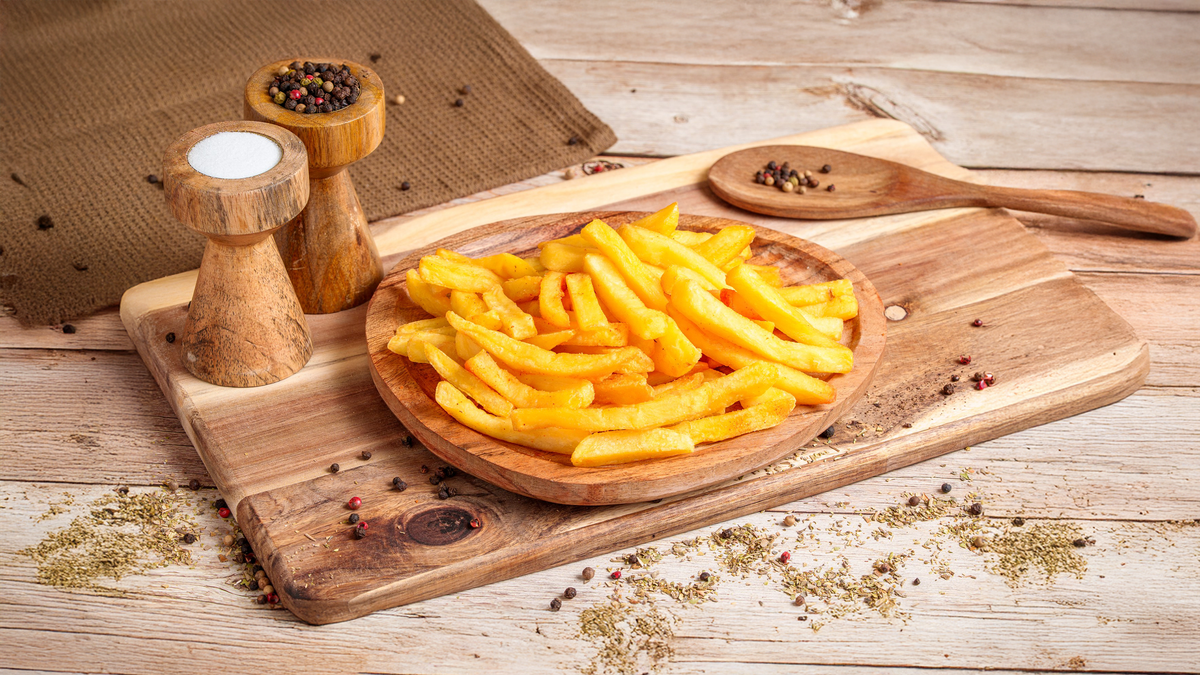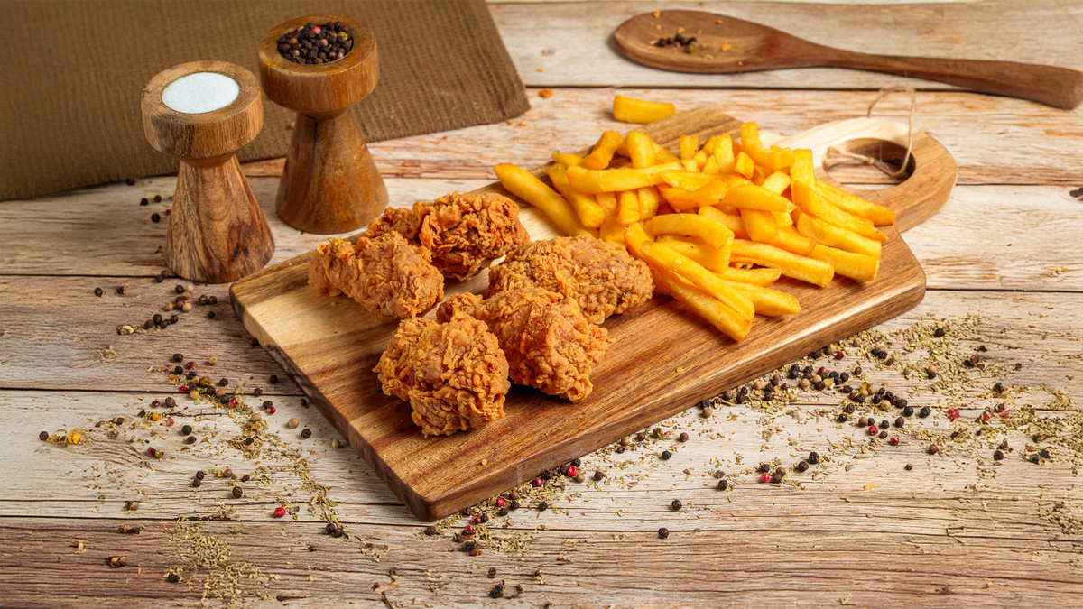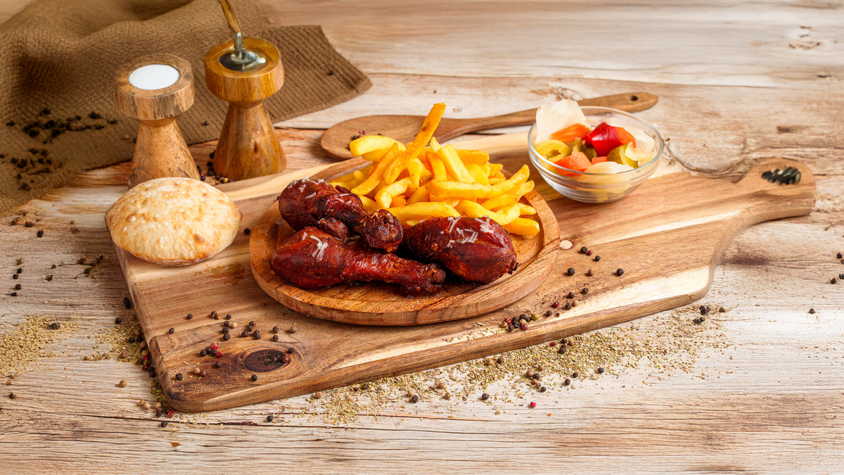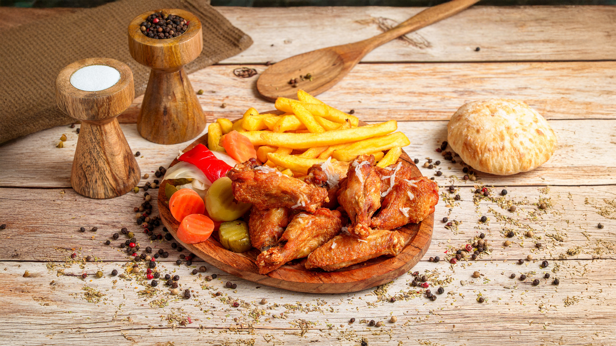 Aripi pui 320g, cartofi prăjiți 150g, salată de varză 100g, chiflă 80g