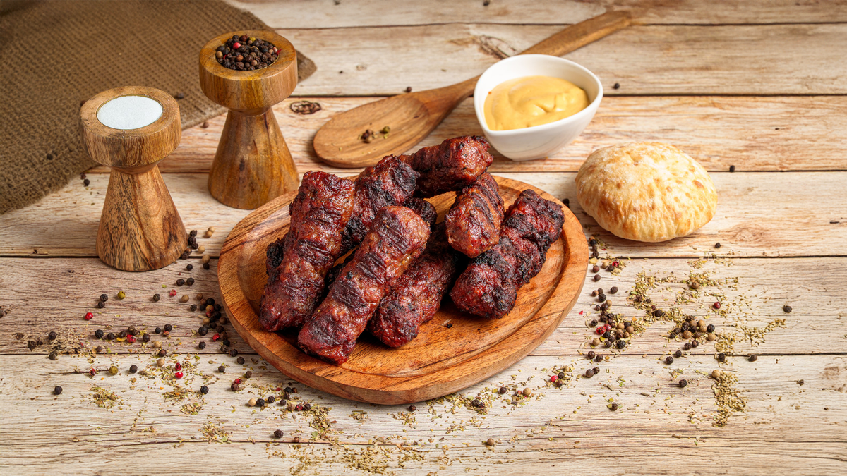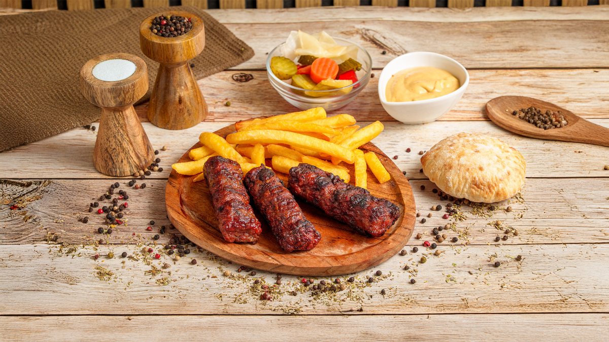 Mici porc + vită, legume, sos, chiflă, cartofi - 750g