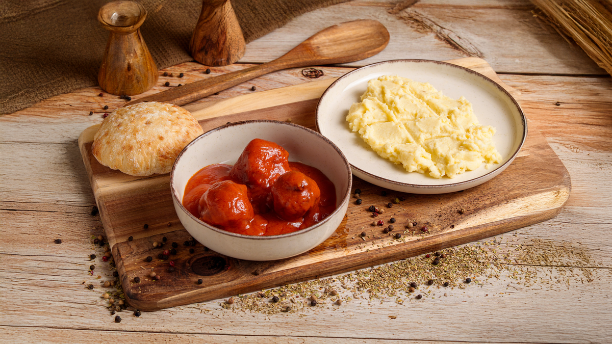 Chiftele marinate in sos roșu 480g, chiftele marinate 300g, murături asortate 100g, chiflă 80g