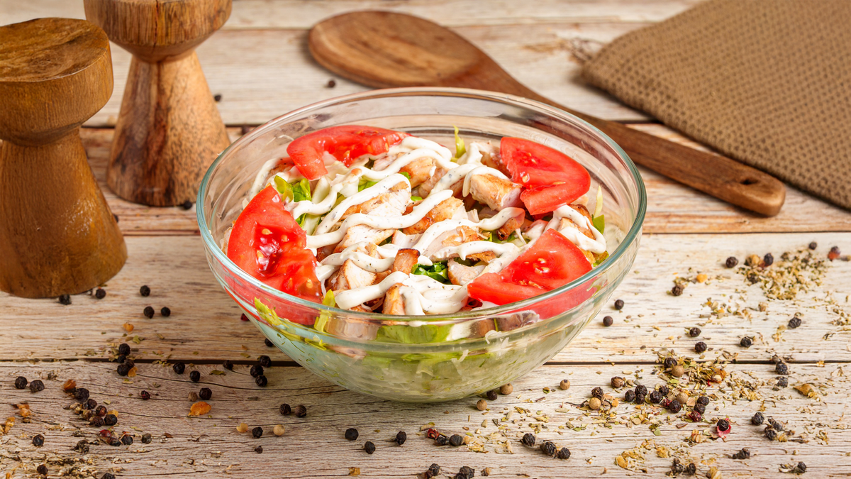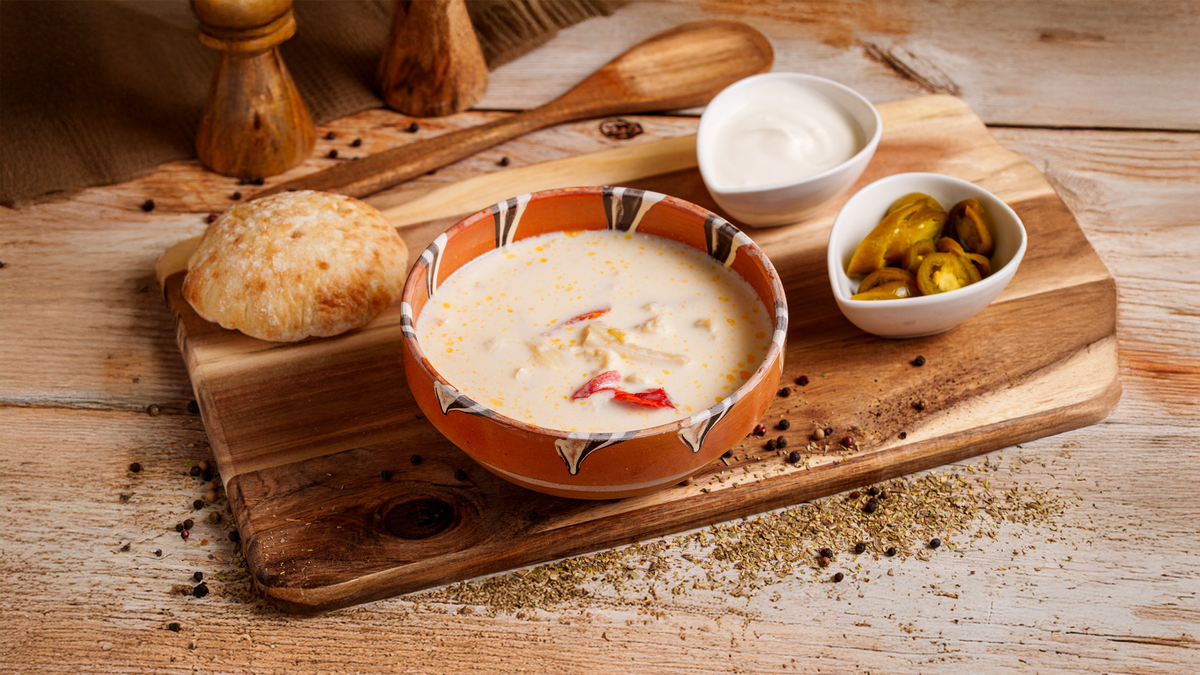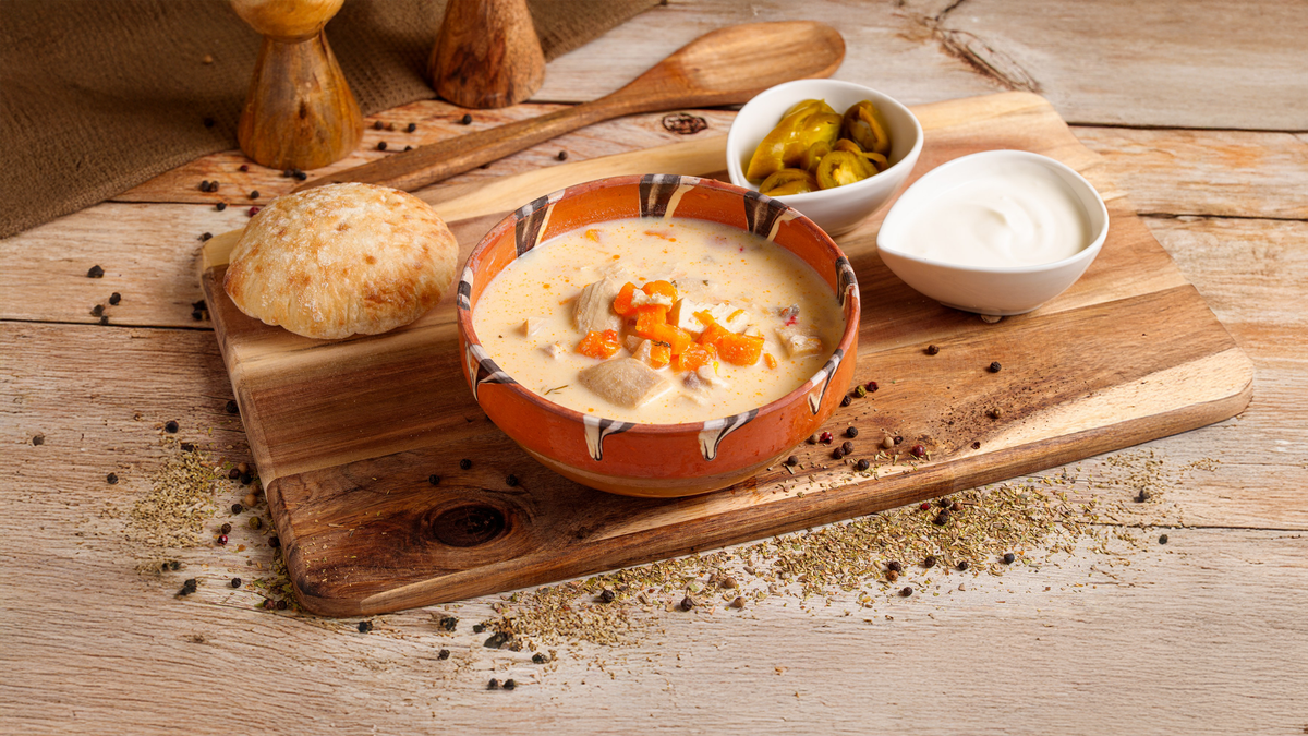 Ciorbă de pui a la grec 400ml, chiflă 60g, ardei iute 30g, smântână 50g