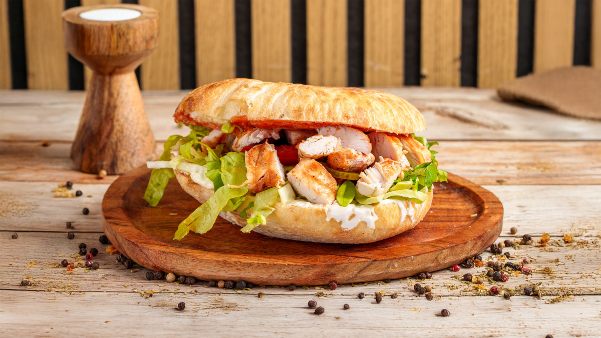 Chifla, carne pui, mozzarella, sos usturoi, maioneza, ketchup, rosii, iceberg - 350g