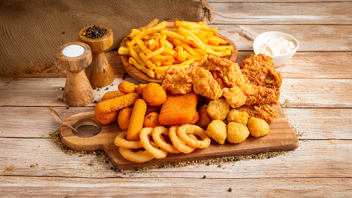 Aripi picante 220g, gujoane piept de pui 200g, mozzarella sticks 120g, bulete pui Kiev 200g, bulete, chilly cheese 110g, cașcaval pane 140g, inele de ceapă 100g, sosuri 200g, cartofi 150g - aproximativ 1450g