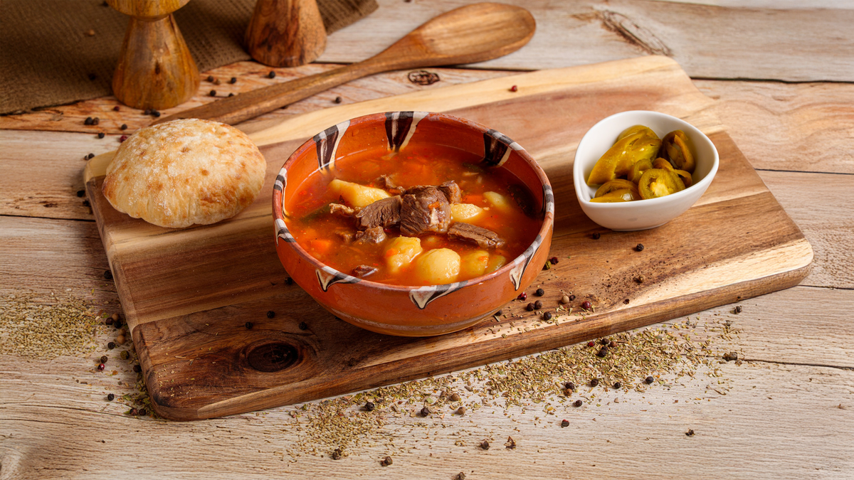 Ciorbă de burtă 400ml, chiflă 60g, smântână 50g, ardei iute 20g