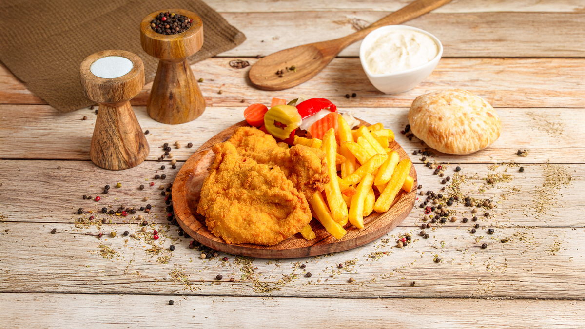 Snițel, legume, sos, chiflă, cartofi - 570g