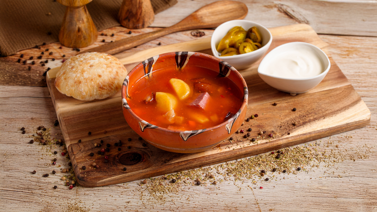 Ciorbă de văcuță 400ml, chiflă 60g, smântână 50g, ardei 20g