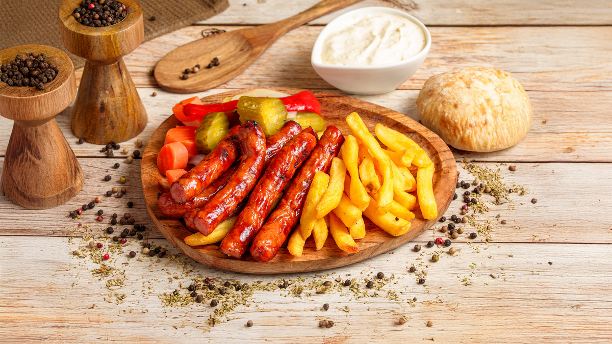 Cârnăciori extra, legume, sos, chiflă, cartofi - 650g