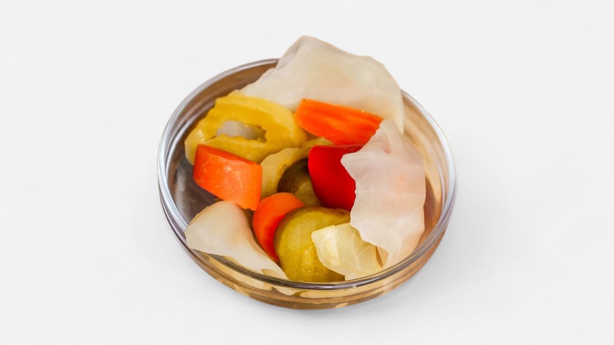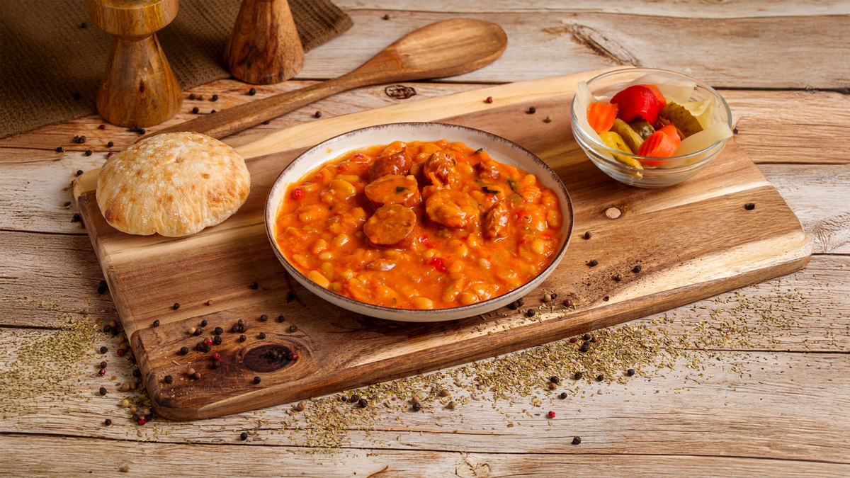 Iahnie cu cârnați 250g, chiflă 60g, murături asortate 100g, ardei iute 20g