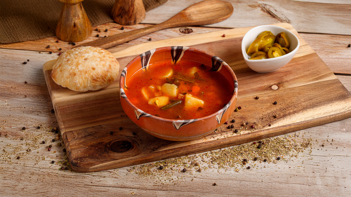 Ciorbă de legume 400ml, chiflă 60g, ardei iute 20g