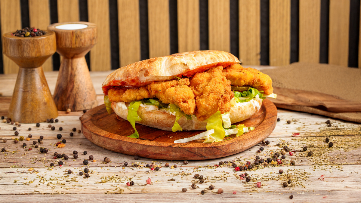 Chifla, snitel pui, sos usturoi, maioneza, cheddar, mozzarella, castraveti murati, cartofi - 370g