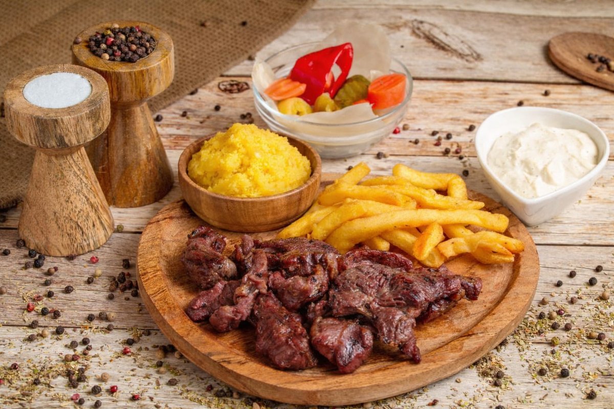 Ceafă de porc marinată in usturoi, cimbru si boia dulce 600g, Cârnați semiafumați 350g, Pastramă de oaie fripta la gratar 400g, Mici tradiționali 500g, Cartofi prăjiți cu brânză rasă 450g, Muștar clasic, Mujdei de ustuoi, Salata murături, ardei iuti