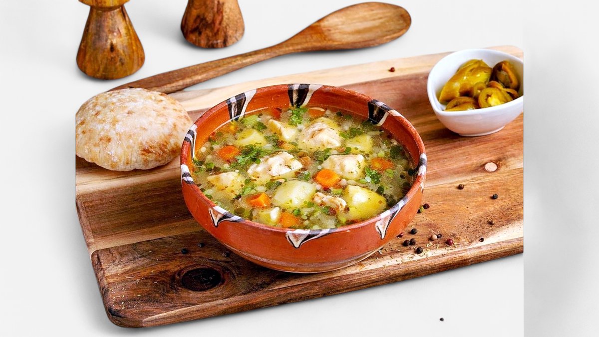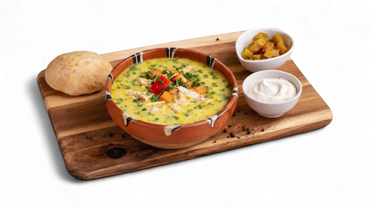 Ciorbă de pui a la grec 400ml, chiflă 60g, ardei iute 30g, smântână 50g