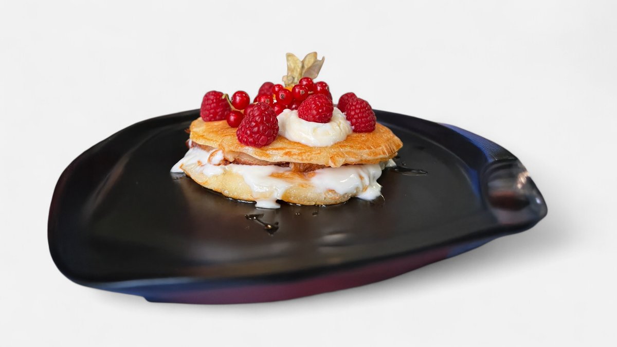 Homemade fluffy pancakes, mascarpone fill, berries, maple syrup - picture perfect! Clatite americane pufoase, facute in casa, umplute cu mascarpone, fructe de padure si sirop de artar - perfecte pentru poza! 200g
