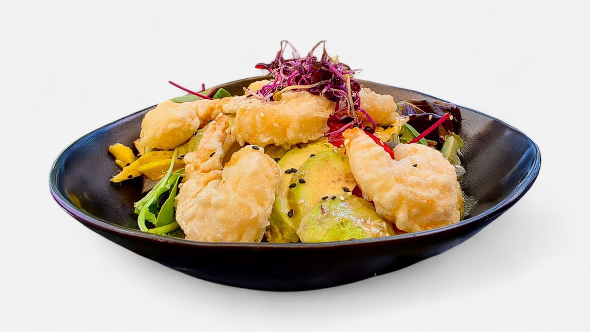 Tempura spicy shrimps, mix of salad, avocado, mango, tomato, Asian style dressing. Creveti in tempura, mix de salata verde, avocado, mango, rosii, cuc sos in stil asiatic. 450g