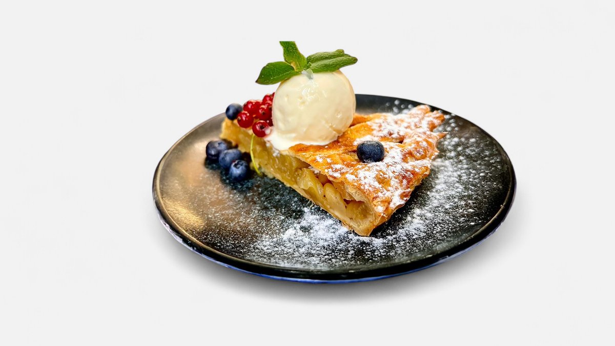 Homemade warm apple pie, served with vanilla icecream - temptation served hot! Placinta cu mere calda, facuta in casa, servita cu inghetata de vanilie - tentatie la cald! 200g