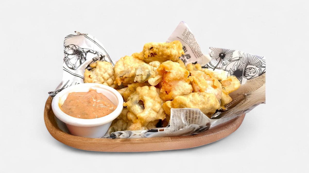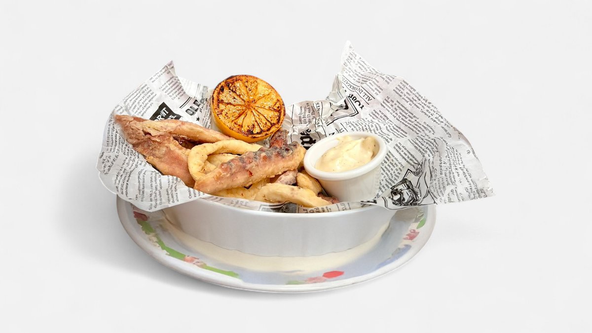 Shrimps, calamari, carrot and cucumber pickles, all deep fried, served with homemade aioli sauce and grilled lemon - sun, sea and crispy waves! Creveti, calamari, morcovi si castraveti murati, prajite si servite cu sos aioli si lamaie la gratar - soare, mare si valuri crocante! 450g