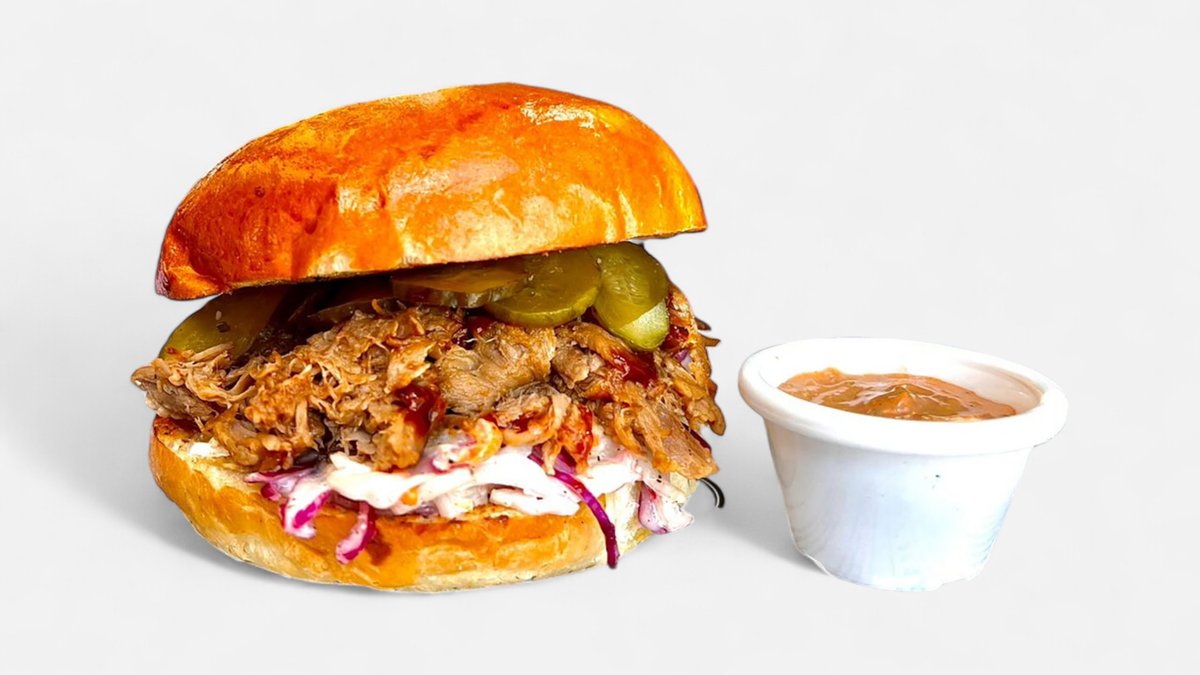 Brioche bun, pulled pork, coleslow salad, homemade pickles, barbeque souce, served with Banjo Jack sauce. Chifla brioche, fasii din carne de porc gatit lent, sos bbq, servit cu sos Banjo. 350g