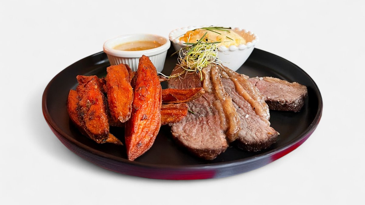Smoked beef brisket. melt-in-your-mouth, mac and cheese, served with sweet potato, corn on grill and Gravy sauce. Piept de vita afumat de se topeste in gura, mac and cheese, servit cu cartofi dulci, porumb la gratar si sos Gravy. 450g
