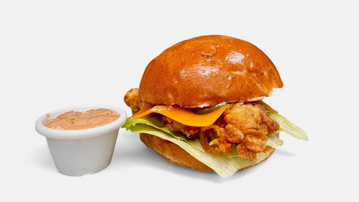 Brioche bun, battered deep fried chicken tights, slice of ceddar, homemade pickles, lollo rosa salad, ranch sauce, served with Banjo Jack sauce, Chifla brioche, pulpa de pui pane, branza ceddar, castraveti acri, salata creata, sos ranch, servit cu sos Banjo. 350g