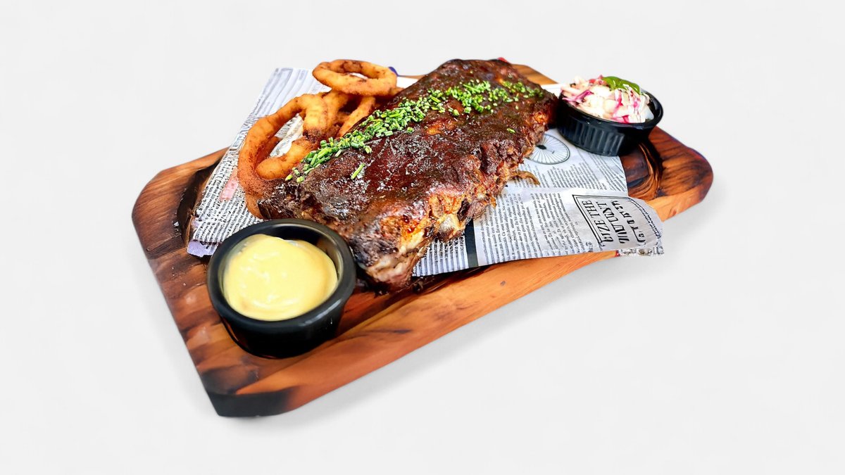 Brioche bun, black angus beef patty, slice of cheddar, crispy bacon, slow cooked pork ribs meat, onion rings, Texas barbeque sauce, lollo rosa salad, a slice of tomato, onion chutney, homemade pickles, served with Banjo sauce. Chifla brioche, chiftea din vita Black Angus, branza ceddar, bacon crocant, carne din coaste de porc, inele de ceapa, sos Texax bbq, salata creata, rosie, dulceata de ceapa, castraveti murati, servit cu sos Banjo. 500g