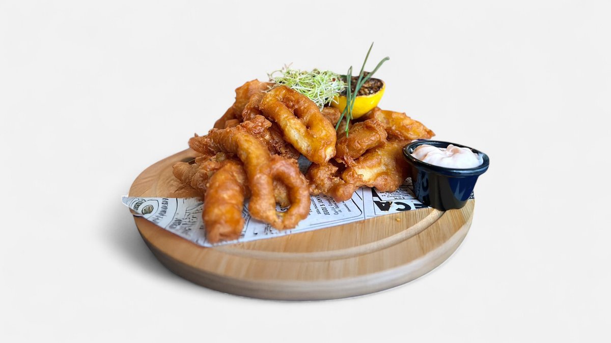 Golden crispy calamari rings, served with aioli - as snappy as a Tarantino scene. Inele de calamar crocante, aurii, servite cu sos aioli cu usturoi - rapide ca un dialog cu Tarantino! 200g
