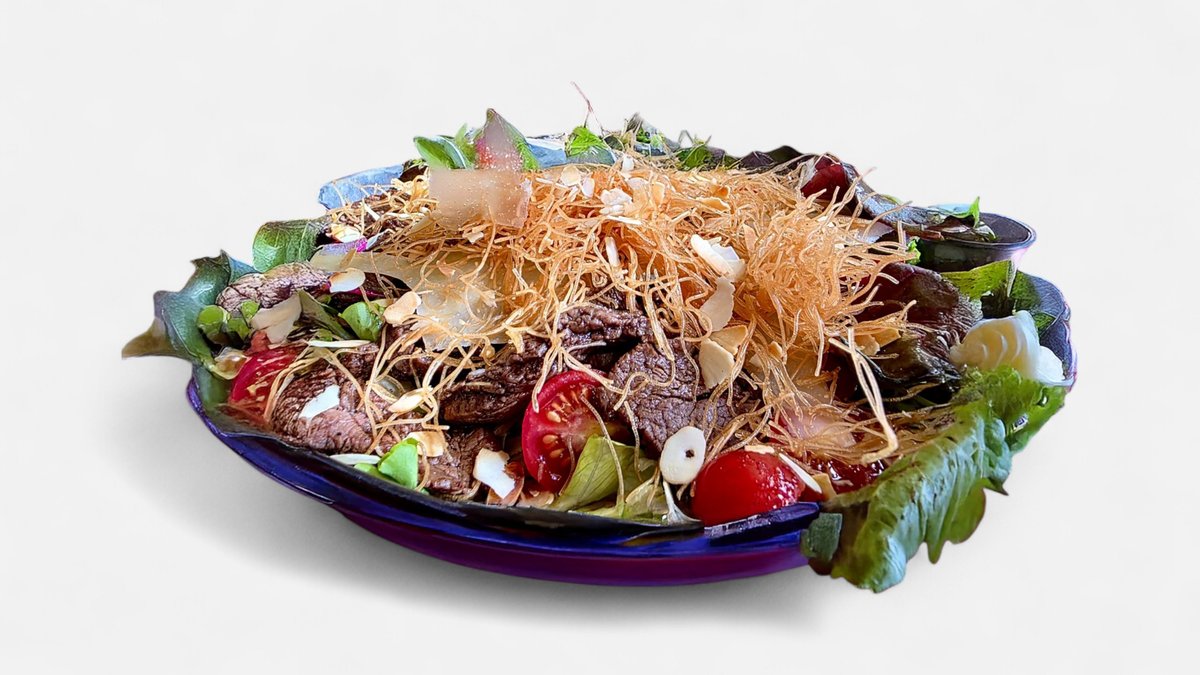 Pan fried beef tenderloin, in balsamic dressing, mix of green salad, tomato cherry, grana duro cheese, almond flakes and deep fried rice noodles. Muschiulet de vita la tigaie in sos balsamic, mix de salata verde, branza dura, fulgi de migdale si taitei din orez prajiti. 400g