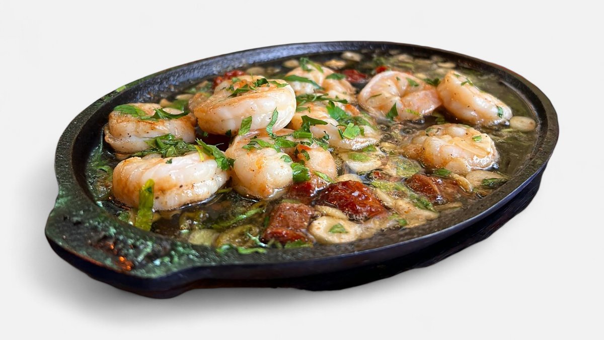 Pan fried shrimps with butter, oil, chilli, garlic, dried tomato, parsley, lemon, served with grilled rye bread - shrimps heaven! Creveti in unt la tigaie, ardei iute, usturoi, rosii uscate la soare, patrunjel si lamaie, serviti cu paine de secara - raiul crevetilor! 250g