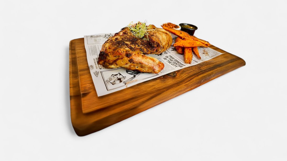 Half roasted jamaican style chicken, served with chimichurri sauce, backed beans, corn on grill and sweet potato. jumatate de pui fript in stil jamaican, servit cu sos chimichurri, fasole neagra, porumb la gratar si cartofi dulci. 800g