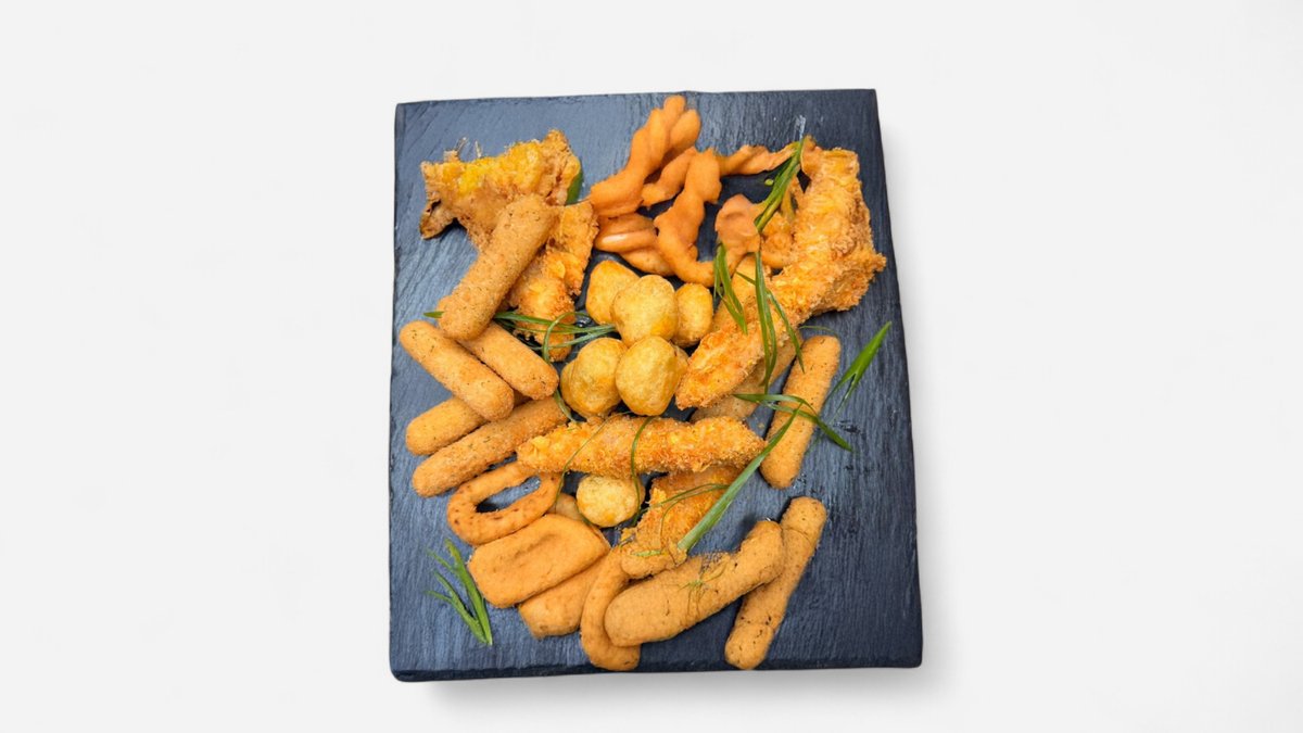 Platou perfectde impartit la masa: inele crocante de ceapa, jalapenos cheese nuggets, mozzarella sticks si chicken fingers. Gustarile ideale pentru orice "game day'! 1100g