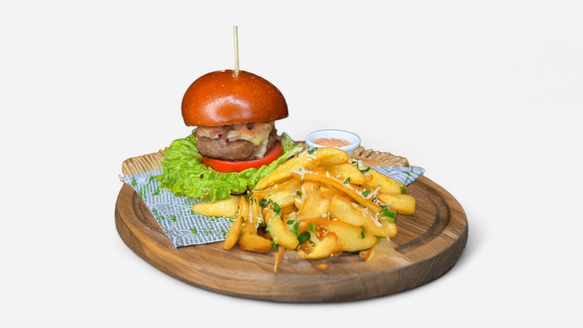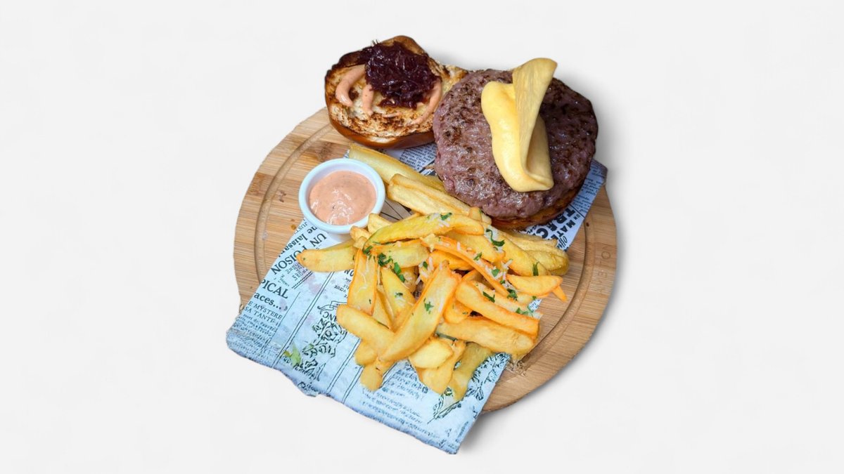 Brioche bun, black angus beef patty, lollo rosa salad, slice of tomato, onion chutney, homemade pickles, topped with cheese, served with Banjo Jack sauce and French fries with parmezan and garlic. 400g