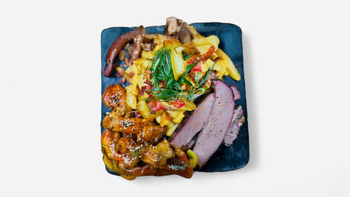 Platou generos cu jerk chicken, brisket fraged, aripioare BBQ sau buffalo, coaste de porc si loaded fries. Servite cu sos Banjo si salata coleslow. A generous platter loaded with jerck chicken, tender brisket, BBQ or buffalo wings, pork ribs and loaded fries. Served with Banjo sauce and coleslow salad. 2100g